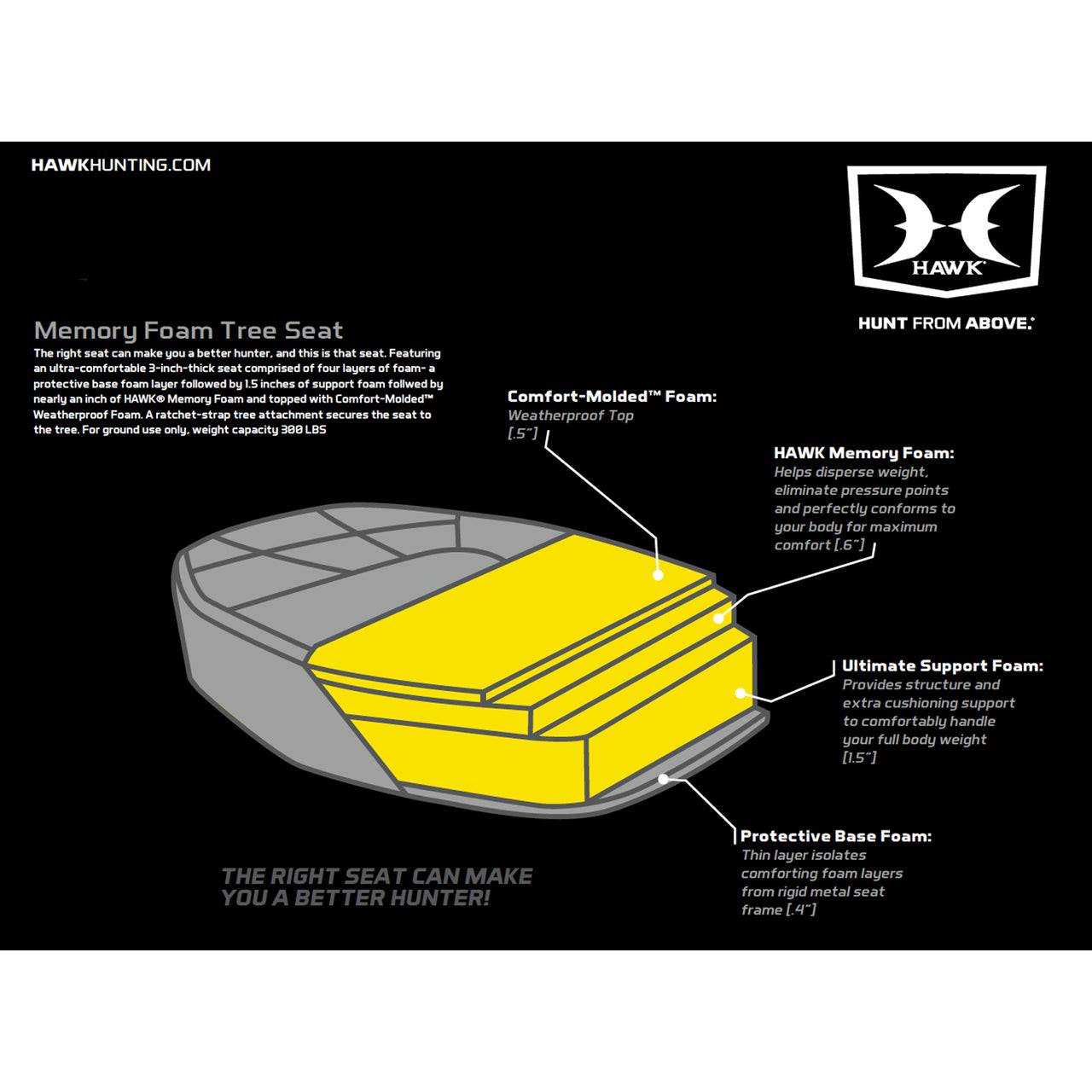 The 3-inch Ultra-Plush Memory Foam seat provides superior comfort and support for long hunts, while Tree Digger™ teeth ensure a secure, wobble-free grip on the tree. Over-molded attachment hooks and premium Teflon® washers eliminate metal-on-metal contact for a completely silent setup. Add the Hawk Cruzr® Tree Bracket (sold separately) for quick hanging, easy removal, and multiple stand locations — ideal for hunters who move frequently throughout the season.
